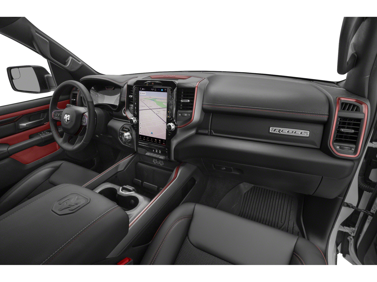 The interior of the Rebel is a true sanctuary, with premium leather-trimmed bucket seats, heated front and rear seats, and a stunning Harman/Kardon 19-speaker premium sound system. The 14.4-inch Uconnect 5 Navigation display puts all your essential controls and information at your fingertips, while the Rebel Level 2 Equipment Group adds a host of advanced features like power-adjustable pedals, a power tailgate, and a dual wireless charging pad.